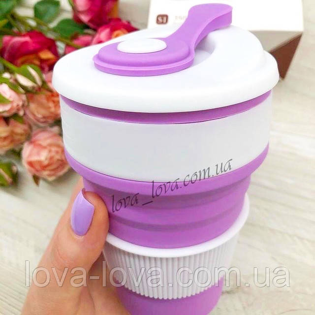 Портативна складана чашка з кришкою виготовлена з харчового термостійкого силікону. Чудовим рішенням від здавлювання і для зручного тримання силіконової чашки є жорсткий пластиковий обідок, який дасть змогу не обпекти пальці, якщо напій занадто гарячий і запобігає його проливанню. Кришка щільно закриває чашку, забезпечуючи герметичність і утримуючи тривалий час температуру напою. Силіконова чашка зручно складається, водночас висота в складеному вигляді становить лише 6 см, її можна навіть покласти в кишеню.